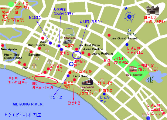 역 앞에 늘어선 툭툭기사와 60b 로 국경까지 가는데 합의하고 국경으로 간다.. 그런데... 얼마 안가니 국경이라고 내리랜다. 에이, 겨우 7분정도 탔나? 날씨만 흐리다면 걸어도 되는 거리지만 짐도 무겁고 하니 타는게 아무래도 좋겠다.국경에서 간단한 출국 수속을 하고 셔틀버스를 타고 우정의 다리를 넘어 라오스 국경으로 갔다. 비자 신청서 쓰고, 입국신고서 쓰니 농카이에서 같이 내린듯한 외국인들이 속속 온다. 금새 2-30명이 되었는데 비자발급에 약 20분이 걸리니 빨리 온게 잘했다는 생각이 든다.  [위앙짠 시내 지도 : 프린트해서 이용하세요. 라오스에서는 시내 지도가 2달러! ] 비자가 발급되고 나서 입국 수속하고 입국세(1인당 10밧)를 내고 입국장밖에 서성대던 택시 운전기사와 100밧에 비엔티안 란쌍 호텔 까지 흥정하고 택시를 탔다. 택시는 상당히 구형이고 에어컨도 없었지만 날이 그리 덥지 않아 시원한 바람을 쐬며 약 40분을 달렸다. (택시 요금 무지 싸다...^^) 란쌍 호텔 앞 길에서 내려 조금 걷다가 세이소울리 게스트하우스에 들었다. 게스트 하우스 게시판에 보니 왕위앙 가는 미니버스를 예약한다고 하길래 1인당 4달러씩을 주고 버스를 예약했다. 12인승 현대 스타렉스. 광고문을 보면 smooth as silk 랜다. ^^** 하긴, 라오스의 지방 시외버스는 아직도 트럭을 개조한 썽테우이니 그럴 만도 하지. [ 세이 소울리 게스트하우스 ]